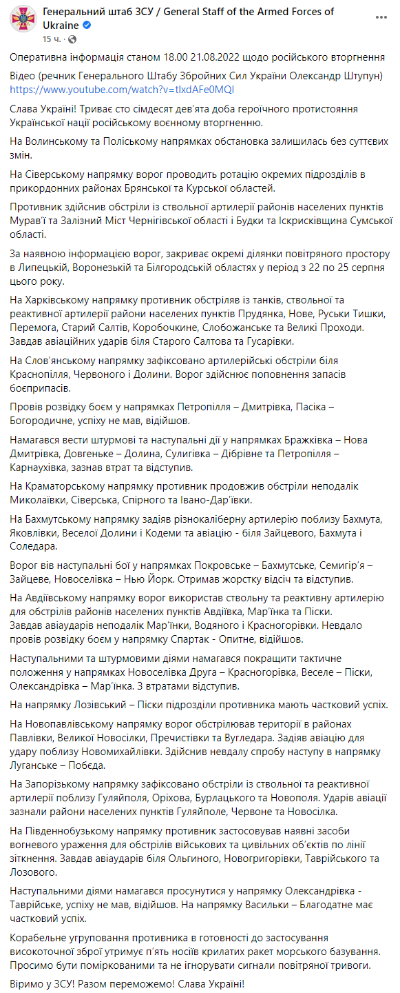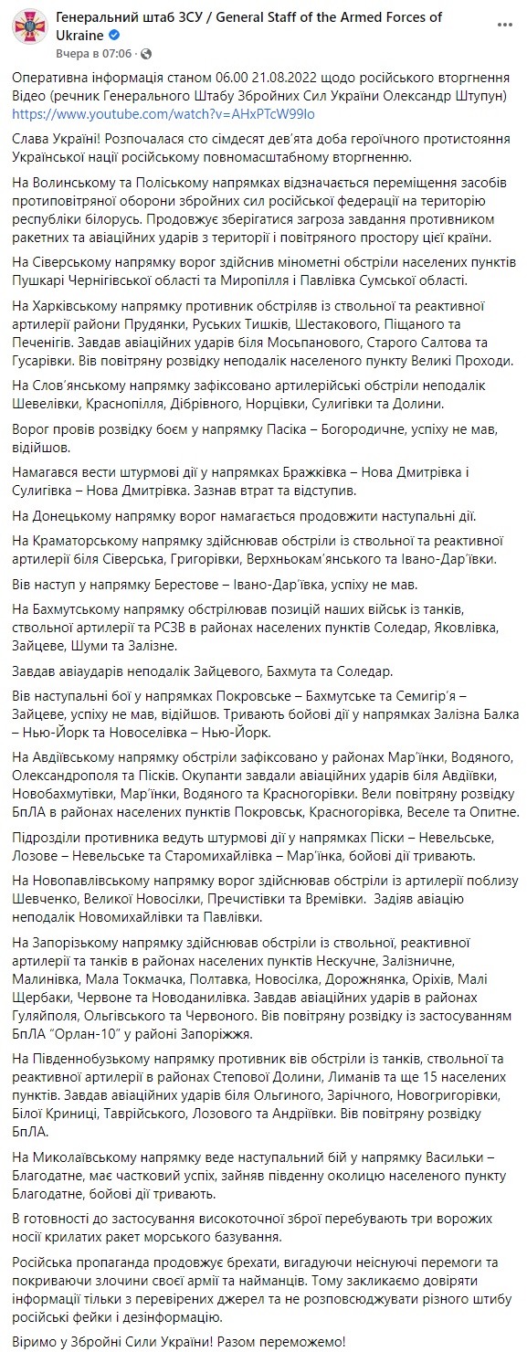 Данные Генштаба: Общие боевые потери противника с 24.02 по 21.08: