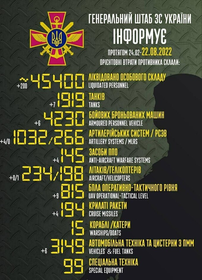 Предлагаем вашему вниманию сводку общих боевых потерь россии с 24.02 по 22.08.