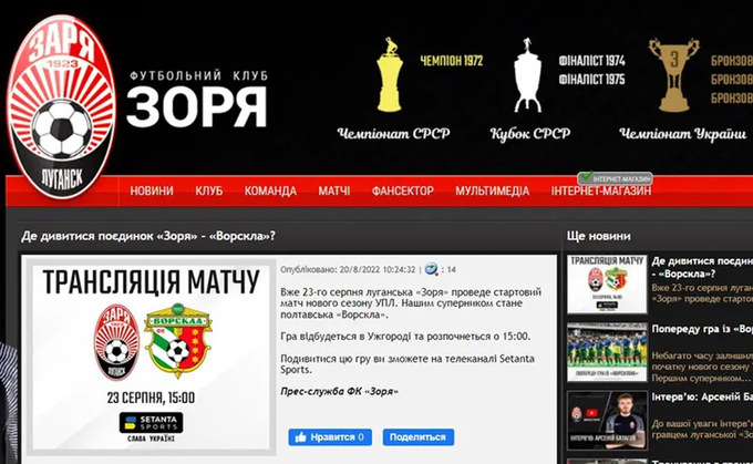 Официальный сайт луганской «Зари» удалил новость о трансляции матча первого тура УПЛ против «Ворсклы» на Setanta.