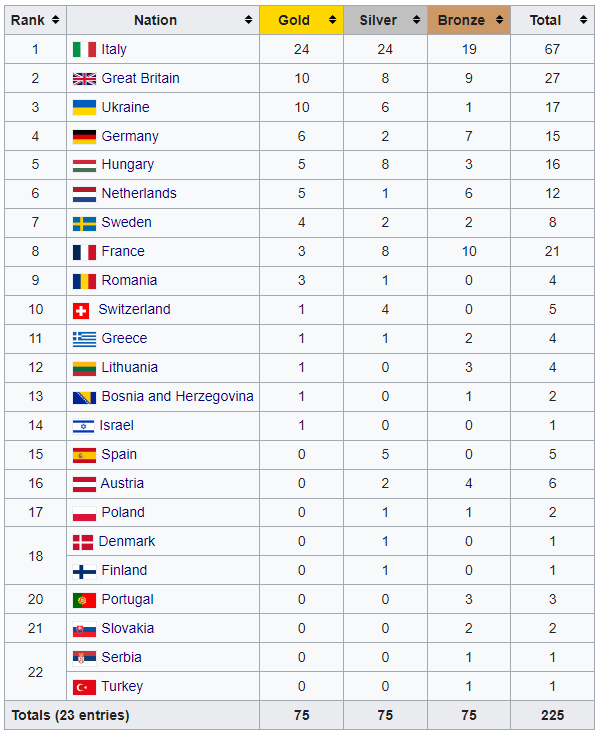 Сборная Украины замкнула топ-3 медального зачета вслед за сборными Италии (24–24–19) и Великобритании (10–8–9).