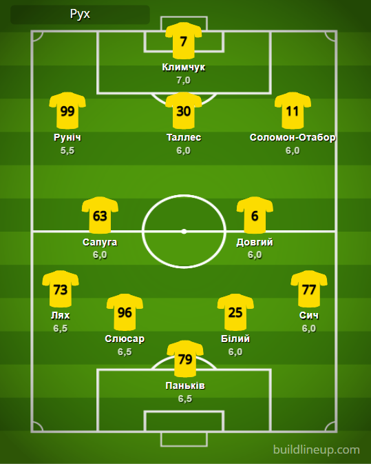 «Рух»: Панькив – Лях, Слесарь, Белый (Дидык, 83), Сыч – Сапуга, Довгий (Федорчук, 69) – Рунич (Карабин, 77), Таллес (Притула, 77), Соломон-Отабор (Б. Бойчук, 70) – Климчук.