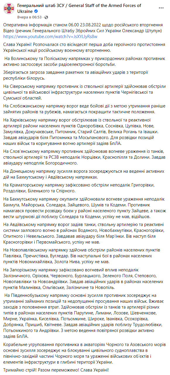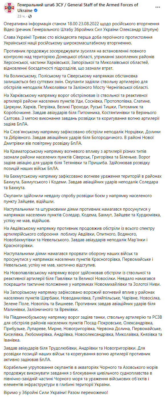 Генеральный штаб ВСУ: Общие боевые потери противника с 24.02 по 23.08 ориентировочно составили: