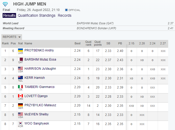 Однако результат победителя в прыжках в высоту оказался низким. Четверо спортсменов прыгнули на 2.24, но не сумели взять 2.27. И-за того, что Андрей Проценко удачно исполнил все предыдущие попытки, он опередил всех конкурентов, включая знаменитого Мутаза Эль-Баршима из Катара.
