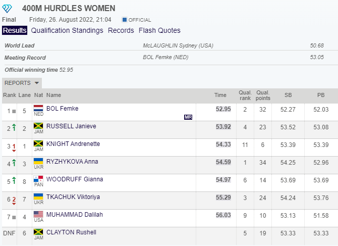 В забеге на 400 м с барьерами Анна Рыжикова – 4-я (54.59), а Виктория Ткачук – 6-я (55.29). Выиграла забег Фемке Бол из Нидерландов, установив рекорд соревнований (52.95).