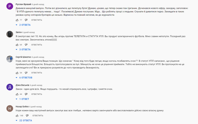 Именно поэтому не удивляет огромное количество негативных отзывов простых болельщиков на YouTube-каналах представителей антителепула, или их «помощников». Даже те, кто ранее был к ним лоялен, сейчас изменили свою позицию, и требуют от УПЛ и УАФ более жестко поступать по отношению к «отступникам». Удивительно? Вовсе нет, потому как ранее «Динамо», «Заря» и «Днепр-1» сами активно лепили «дракона» из телеканалов «Футбол», а когда те стали частью истории, то просто заняли освободившееся место «дракона», даже не заметив, что большую часть прежних собственных аргументов они стали попросту перечеркивать своими же действиями.