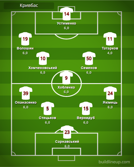 «Кривбасс»: Сарнавский – Опанасенко (Шевченко, 66), Стецьков, Вернидуб, Якимец – Хомченовский, Хобленко (Банада, 75), Семенов – Волошин, Устименко (Дебелко, 82), Татарков.