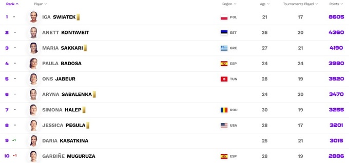 В первой десятке состоялось одно изменение – Дарья Касаткина и Гарбинье Мугуруса поменялись местами.