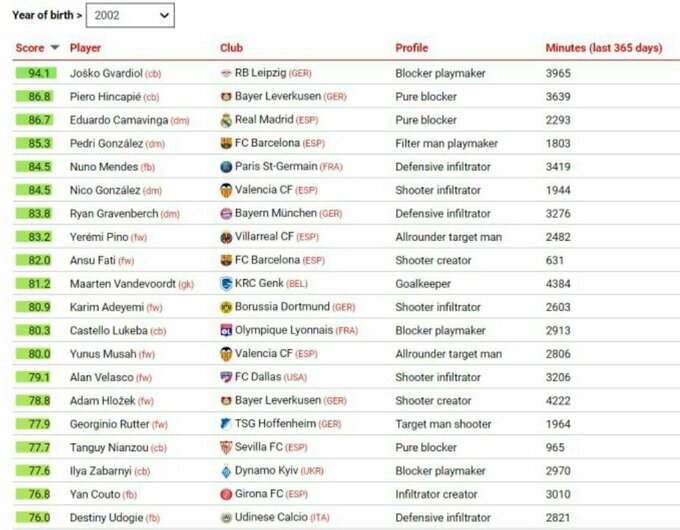 В списке футболистов 2000 года рождения лидирует Винисиус Жуниор из «Реала» (100.0), 2001-го – Букайо Сака из «Арсенала» (92.4), 2002-го – Йошко Гвардиол из «РБ Лейпциг» (94.1), 2003-го – Джуд Беллингем из «Боруссии» Д (91.5) и 2004-го – Гави из «Барселоны» (93.2).