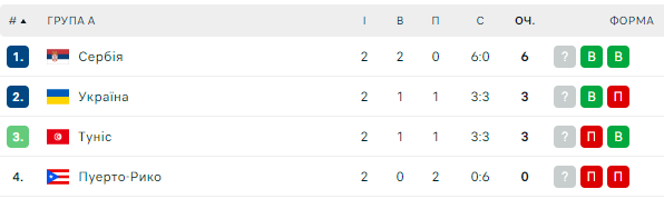 Сборная Украины стартовала на мировом первенстве с поражения от сборной Сербии (0:3), а затем обыграла Тунис (3:0) и занимает второе место в турнирной таблице.