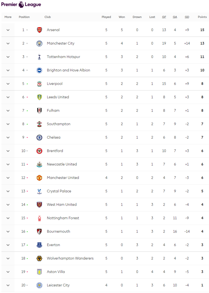 «Канониры» сохраняют лидерство в АПЛ, набрав 15 очков после 5 матчей, у «Ман Сити» – 13 очков и второе место.