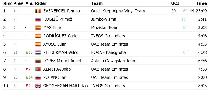 Красную майку лидера общего зачета сохранил Ремко Эвенпул из «Quick Step». Марк Падун сегодня финишировал 39-м и опустился в общем зачете на 20-е место.