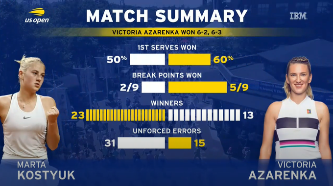 Ну і, звичайно, програні майже всі важливі м'ячі. Білоруска не мала особливої переваги, незважаючи на рахунок, але варто лише подивитися на процент виграних брейкпойнтів. А така статистика є типовою для Марти. На високому рівні так грати не можна.