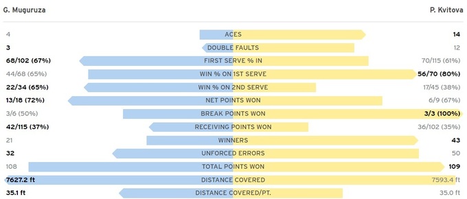 При счете 5:6 в в третьем сете Мугуруса имела два матчбола на приеме, но чешке удалось отыграться. На финальном таё-брейке уже испанка отыграла три матчбола, но на четвертом допустила невынужденную ошибку.