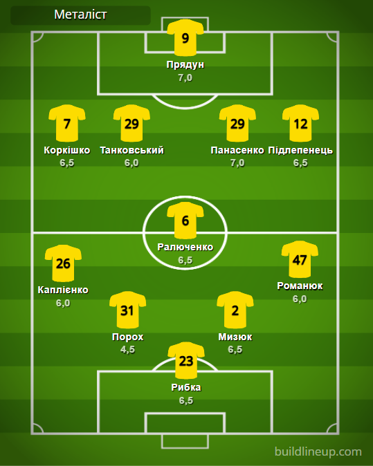 «Металлист»: Рыбка – Каплиенко, Порох, Мизюк, Романюк – Ралюченко – Коркишко, Танковский, Панасенко (Шопин, 90+2), Пидлепенец (Кныш, 69) – Прядун (Рязанцев, 82).
