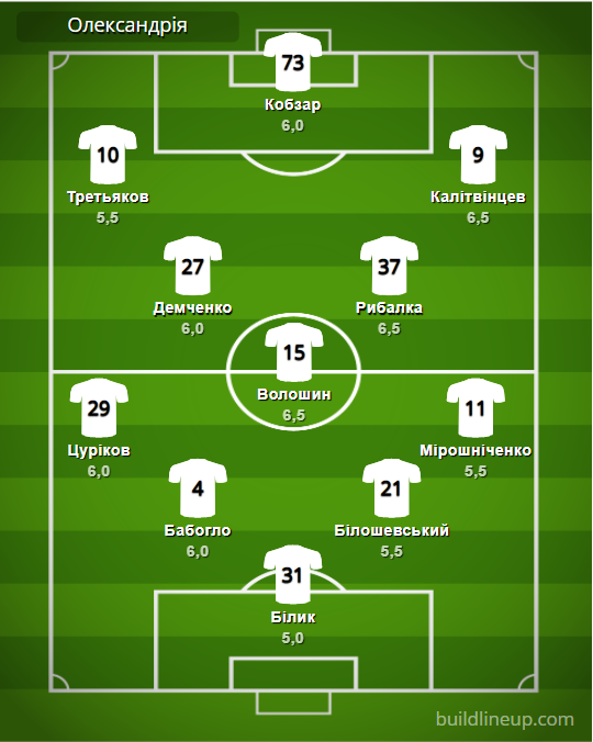 «Александрия»: Билык – Цуриков, Бабогло, Билошевский, Мирошниченко – Демченко, Волошин (Авагимян, 46), Рыбалка (Дришлюк, 75) – Третьяков (Кожушко, 31), Кобзарь (Костышин, 46, Бондаренко, 79), Калитвинцев.