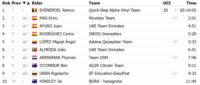 Красную майку лидера сохранил бельгиец Ремко Эвенпул из «Quick Step». На старт сегодняшнего этапа из-за травм не вышел Примож Роглич, который шел вторым в общем зачете.