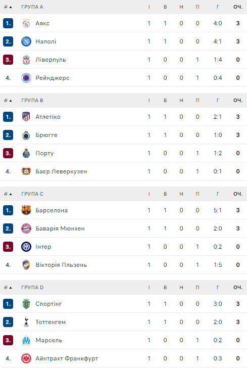 7 сентября состоялись матчи 1-го тура Лиги чемпионов в четырех группах A–D. Отмечаем главные события игрового дня.