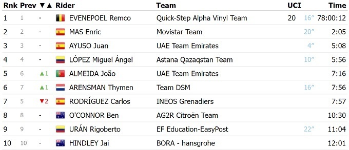 Бельгиец Ремко Эвенпул из «Quick Step» удержал красную майку лидера и фактически обеспечил себе победу в общем зачете. Вуэльта финиширует завтра спринтерским этапом в Мадриде.