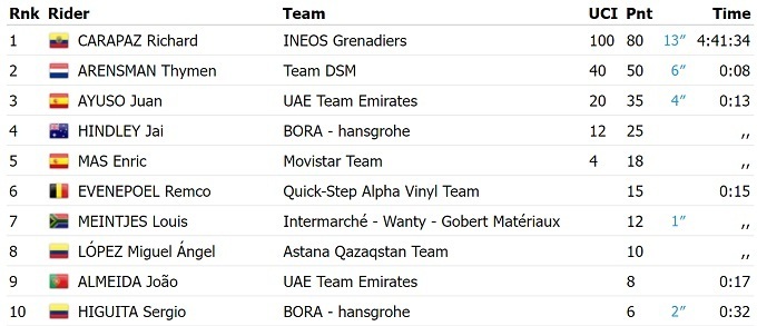 Эквадорский велогонщик команды «Ineos Grenadiers» Ричард Карапас стал победителем предпоследнего, 20-го этапа Вуэльты-2020. Для него это третья победа на нынешней Вуэльте.