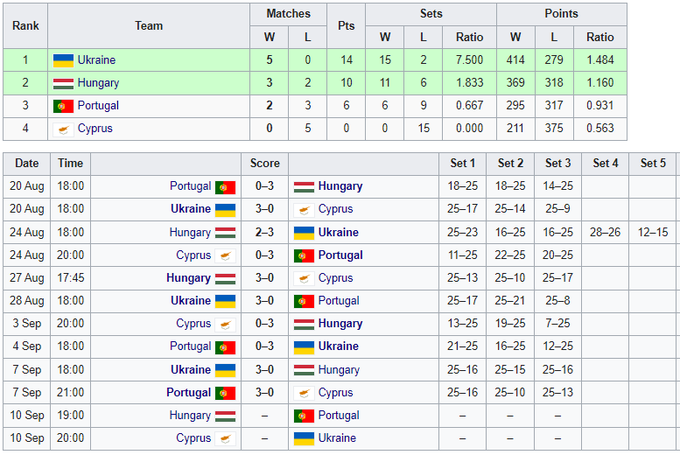 10 сентября в 20:00 в последнем 6-м туре квалификации чемпионата Европы по волейболу среди женщин в группе С сыграют сборные Кипра и Украины.