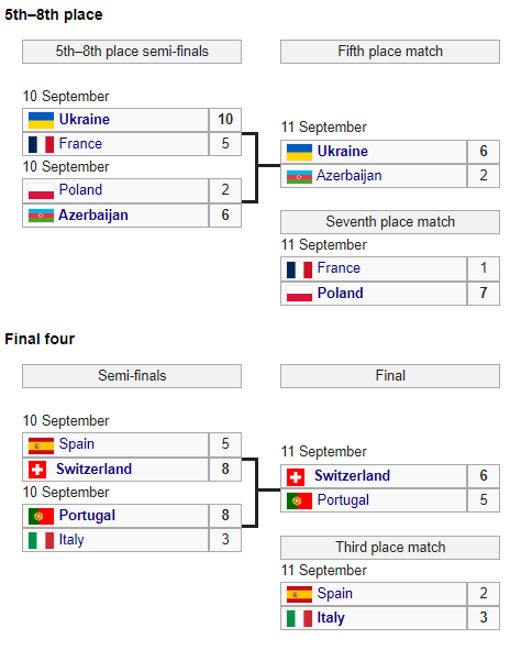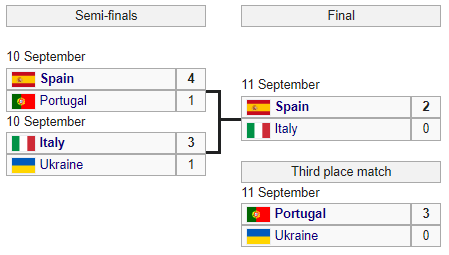 У женских команд Украина проиграла Португалии (0:3) поединок за третье место, а трофей разыграли Испания и Италия (2:0).