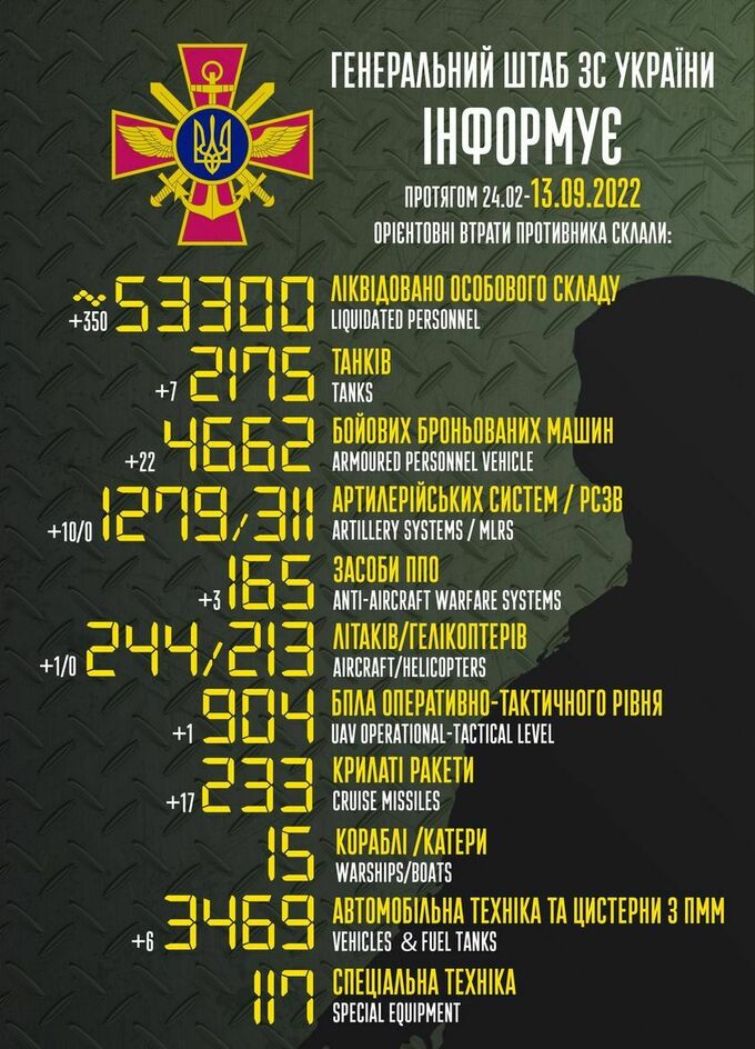 Предлагаем вашему вниманию сводку общих боевых потерь россии с 24.02 по 13.09.