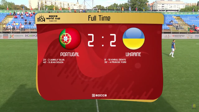 13 сентября состоялся матч 3-го тура ЧМ-2022 по Socca в венгерском Будапеште. Вничью сыграли сборные Португалии и Украины (2:2).