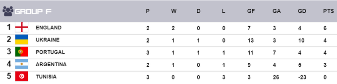Сборная Украины сначала разгромила Тунис (11:1), а затем сыграла вничью с Португалией (2:2). Сине-желтые занимают 2-ю позицию (4 очка). Португалия имеет такой же набор баллов, но сыграла на одну игру больше. Аргентина записала в актив 3 пункта после 2 матчей. А лидирует в группе Англия с двумя победами.