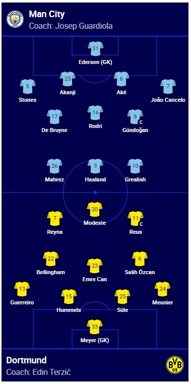 «Манчестер Сити»: Эдерсон – Стоунз, Аканджи, Аке, Канселу – Де Брюйне, Родри, Гюндоган – Марез, Холанд, Грилиш