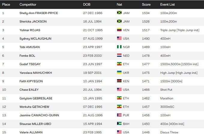 Возглавляет мировой рейтинг World Athletics Шелли-Энн Фрейзер-Прайс из Ямайки. Она выиграла «Бриллиантовую лигу»-2022 в беге на 100 м, стала чемпионкой мира в этой же дисциплине, а также взяла две серебряные награды ЧМ – в беге на 200 м и в эстафете 4х100.