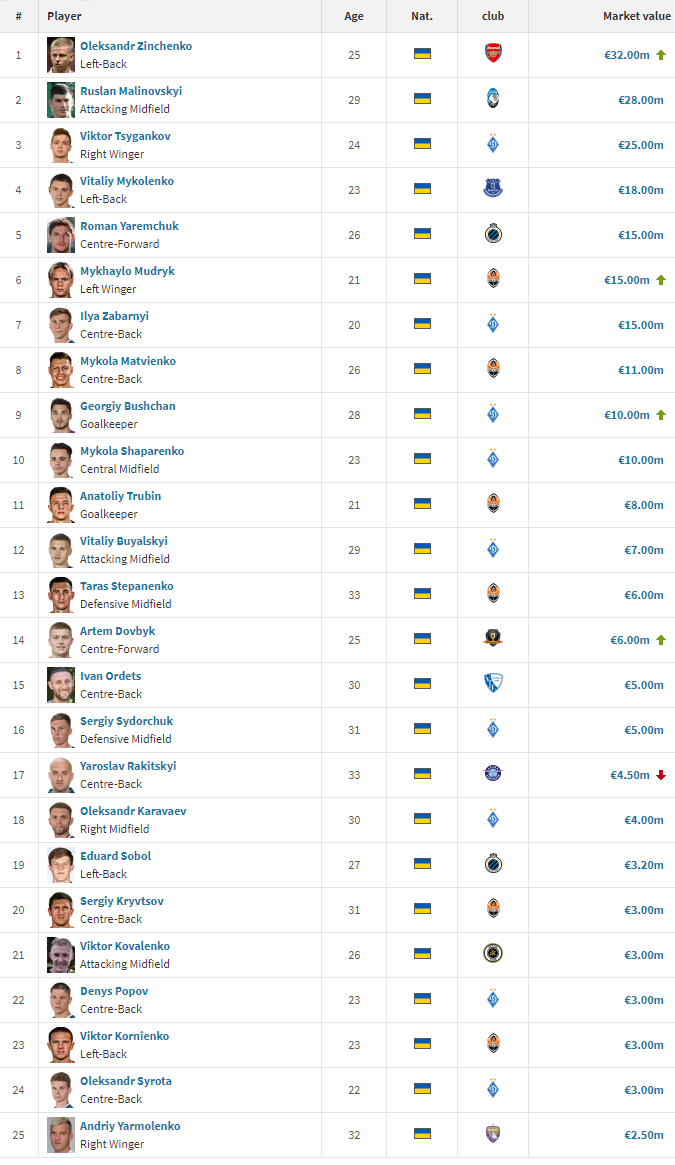 Следом за ними в списке расположились Виктор Цыганков (25 млн евро, «Динамо»), Виталий Миколенко (18 млн евро, «Эвертон», Англия), Роман Яремчук (15 млн евро, «Брюгге», Бельгия), Михаил Мудрик (15 млн евро, «Шахтер») и Илья Забарный (15 млн евро, «Динамо»).