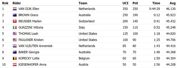 Нидерландская велогонщица Эллен Ван Дейк стала чемпионкой мира в гонке с раздельным стартом среди женщин. Она опередила хозяйку соревнований Грейс Браун и швейцарку Марлен Ройссер.