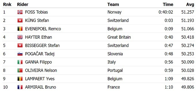 Норвежский велогонщик Тобиас Фосс сенсационно стал чемпионом мира в гонке с раздельным стартом. Он опередил швейцарца Штефана Кюнга и бельгийца Ремко Эвенпула. Чемпион двух предыдущих лет, итальянец Филиппо Ганна, финишировал только седьмым.