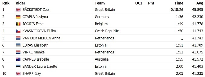 Британская велогонщица Зои Бэкстедт с огромным преимуществом стала чемпионкой мира среди юниорок (до 19 лет) в гонке с раздельным стартом. На дистанции всего в 14,1 км она более чем на полторы минуты опередила немку Юстыну Чаплю и бельгийку Фебе Йоорис.