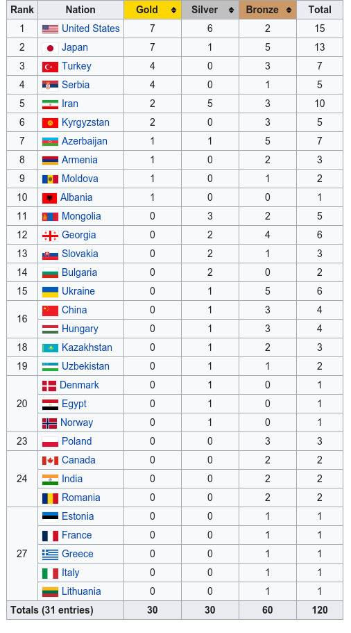 В топ-3 медального зачета вошли сборные США (7–6–2), Японии (7–1–5), Турции (4–0–3).