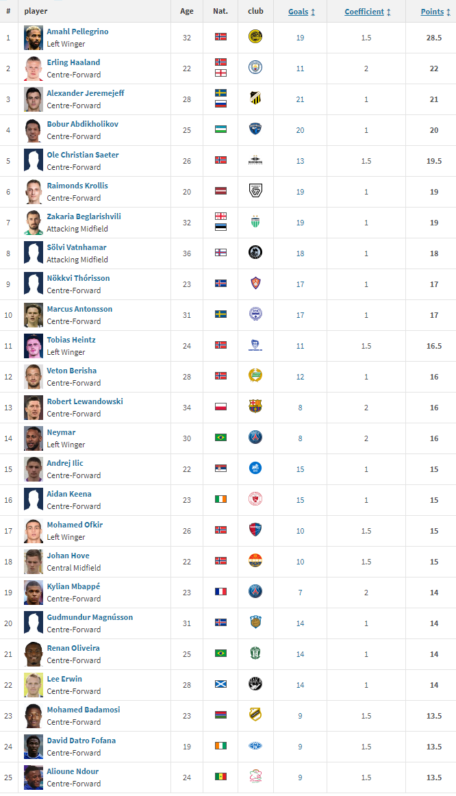 В Европе продолжаются европейские чемпионаты. Лидером в текущем рейтинге ESM Golden Shoe (Золотая бутса) является Амаль Пеллегрино, который забил за «Буде-Глимт» 19 голов (28,5 очков), но чемпионат Норвегии близок к финишу, поскольку проводится по системе весна-осень.