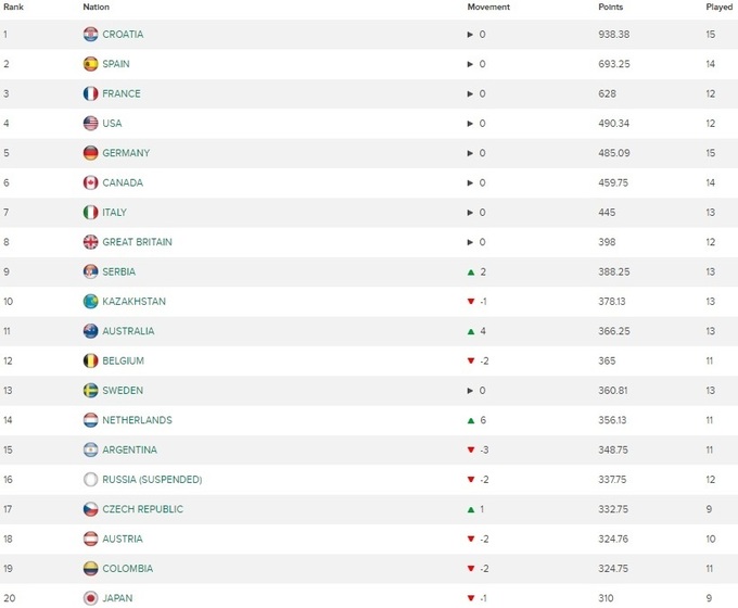 Мировую классификацию продолжает возглавлять сборная Хорватии. Также в топ-5 находятся команды Испании, Франции, США и Германии.