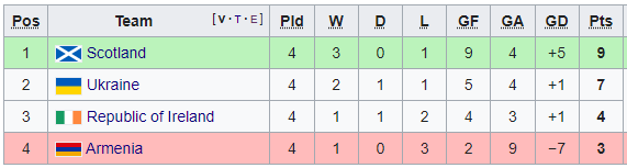 Украина теперь на втором месте в группе (7 очков), лидером стала Шотландия (9 пунктов). Далее Украина сыграет на выезде в Армении (24 сентября), а затем будет решающий матч против Шотландии в Кракове (27 сентября).