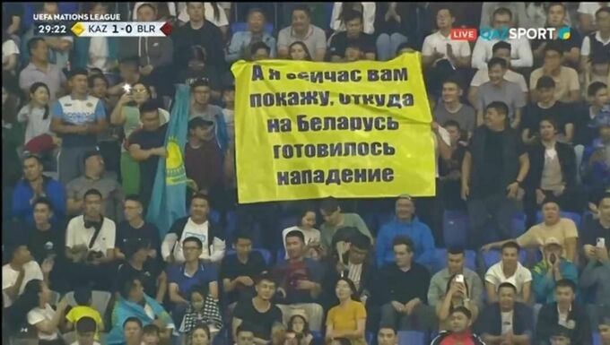 Казахстанцы принесли на матч плакат с легендарной фразой: «А я сейчас покажу, откуда на Беларусь готовилось нападение», – написано синими буквами на желтом фоне.