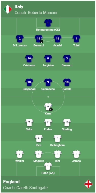 Италия: Доннарумма – Бонуччи, Ачерби, Толой – Димарко, Жоржиньо, Кристанте, Барелла, Ди Лоренцо – Распадори, Скамакка