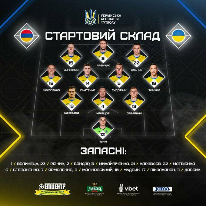 Украина: Лунин – Качараба, Кривцов, Забарный – Миколенко, Игнатенко, Сидорчук, Тымчик – Цыганков, Яремчук, Зубков