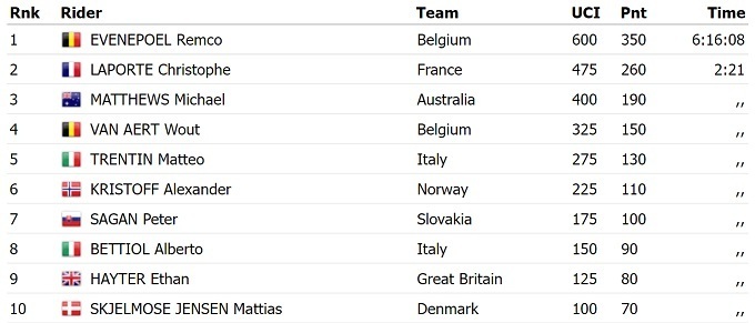 Серебро у француза Кристофа Лапорта, бронзу хозяевам, сборной Австралии, принес Майкл Мэттьюз. Один из топ-фаворитов, Матье Ван дер Пул, перед стартом попал в скандал, и в итоге сошел с гонки.