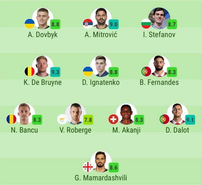 Полузащитники: Бруно Фернандеш (Португалия), Даниил Игнатенко (Украина), Кевин Де Брюйне (Бельгия);