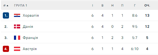 Франция проиграла Дании (0:2), но избежала вылета, набрав лишь на очко больше Австрии (5 против 4).