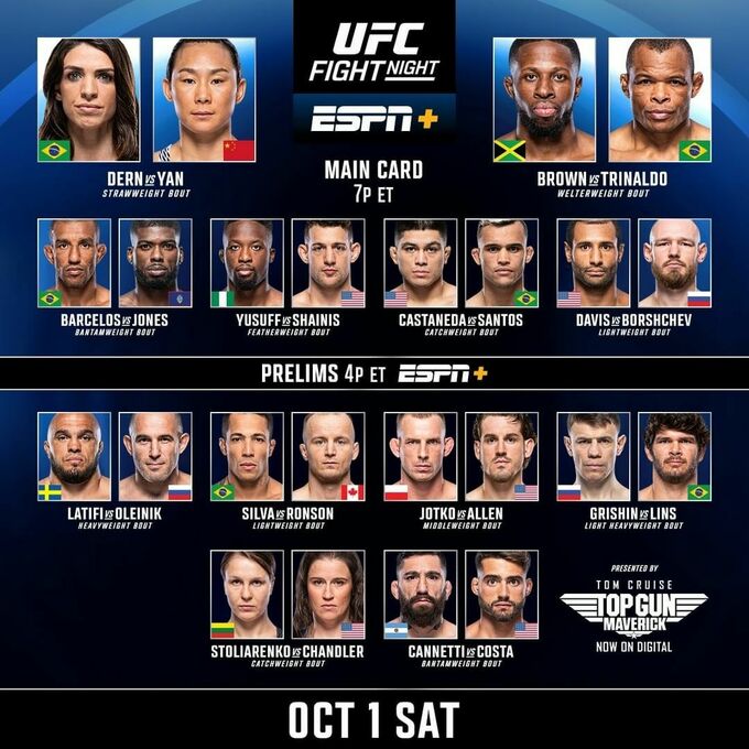 Предварительные бои стартуют в 23:00, основной кард запланирован на 02:00, а главный бой турнира начнется около 04:30 по киевскому времени. В прямом эфире турнир покажут ESPN и UFC TV. В Украине бои можно посмотреть на Setanta Sports+. Все новости о турнире будут доступны оперативно на Sport.ua.