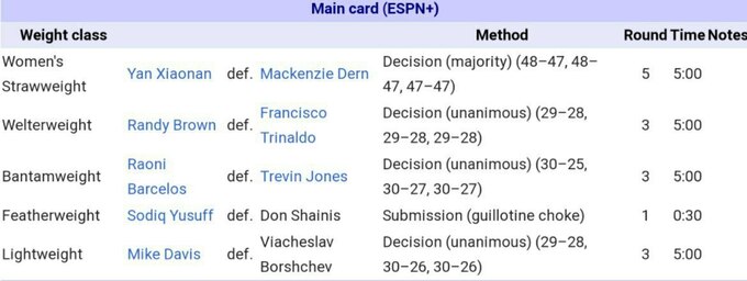 Главным боем была встреча Маккензи Дерн и Янь Сяонань. Китаянка решением судей победила представительницу Бразилии.
