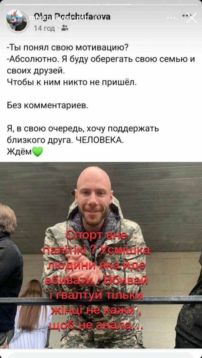 «Спорт вне политики? Улыбка человека, который идет убивать. Убивай и насилуй, только жене не говори, чтобы не знала», - написала Меркушина в сторис Instagram.