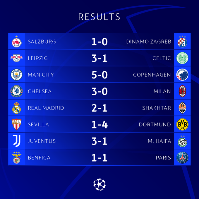 Убедительные победы с большим количеством голов одержали Ман Сити, Боруссия Д, Челси, Ювентус.