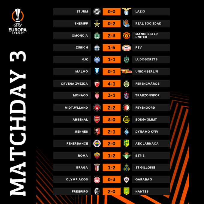 6 октября состоялись матчи 3-го тура Лиги Европы. Ниже приведены их результаты.