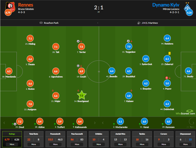 6 октября в 22:00 в матче 3-го тура Лиги Европы французский «Ренн» победил киевское «Динамо» (2:1).